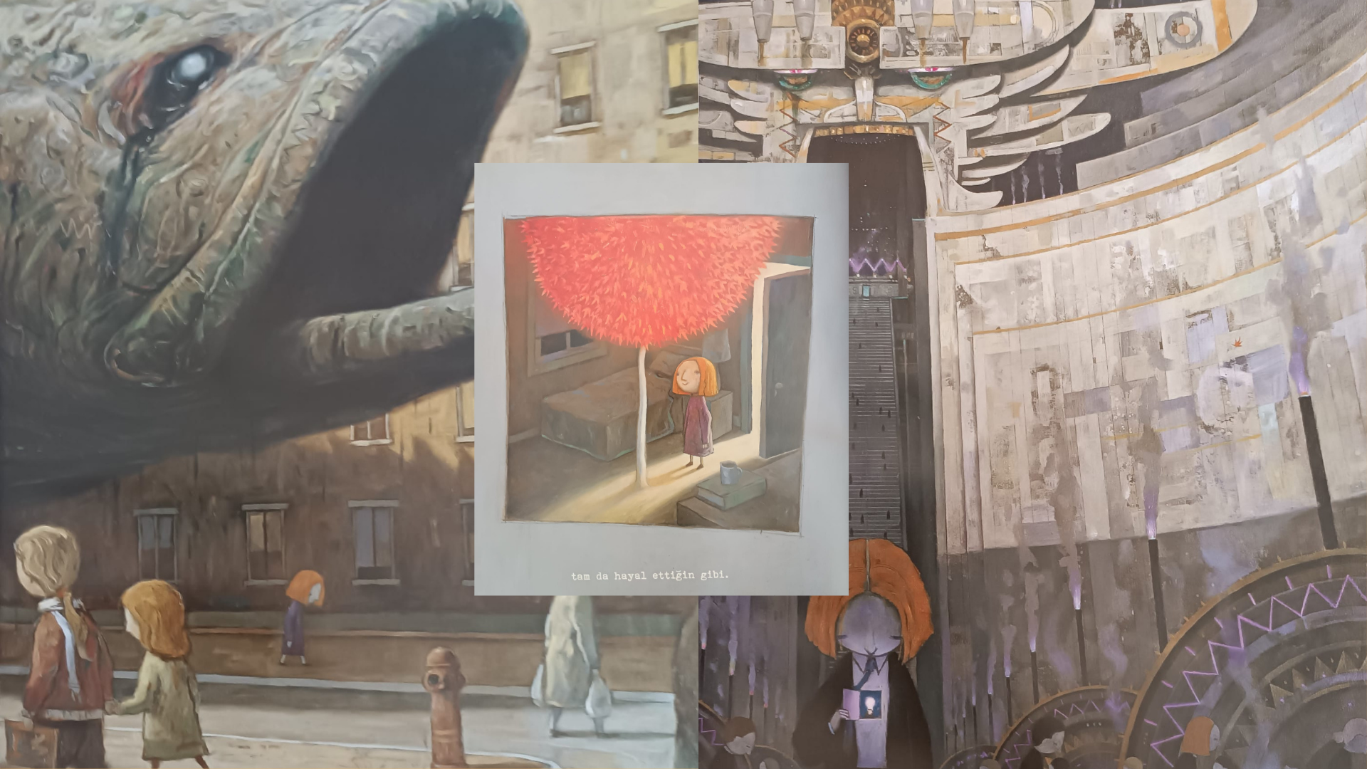 Yazının başında da söylediğim gibi Shaun Tan resimli kitaplarını merak eden herkes için hazırlıyor. Kitaplardaki kasvet, hüzün gibi duygular ya da sistem, tektipleşen insan temaları, çizimlerdeki koyu renk kullanımı, yoğun detaylar nedeniyle çocuklara uygun olmadığını düşünenler olduğunu biliyorum ancak  herhangi bir yaş grubunu çemberin dışına iten hikâyelerle karşılaşılmıyor bu metinlerde. Anlatılan durumlar, farklı anlamlar yüklenerek, çocuk ya da yetişkin her bireyin hayatında karşılık bulabilir. Bu çok meşgul insanlar, çocuklara gösterilen ‘iyi gelecek fotoğrafları’ da aslında:  Hep daha yukarıya ulaşmaya çalışan ve fark etmeden kendisini bile yok sayan, çürümeye başlayan insanlar. Çocukluklarını kurallar ve idealler arasında geçiren küçük okurlar hayallerin ve aydınlığın peşinden gitmeyi, umudu beklerken yılmamayı görecekler bence. Özellikle Kızıl Ağaç’daki arayış hikâyesinin değerli olduğunu düşünüyorum bu açıdan.  Tan’ın kitaplarında hüzün, yalnızlık ve kasvet var ama karamsarlığa yer yok bana kalırsa.