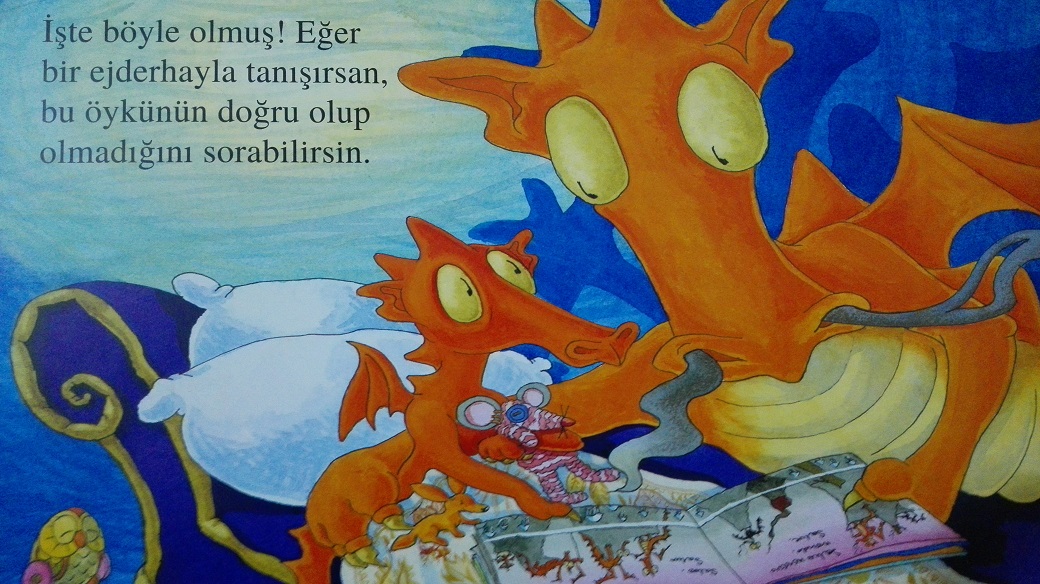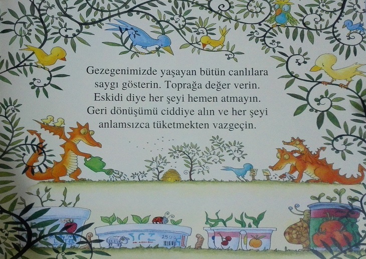 Azıcık şuuru olan ağaca kıyar mı? Ama işte bu ejderhacıkların gözünü tüketmek hırsı; varlığına katkı sunmadığını ezip geçmenin zevki bürümüş. Alevler, çöpler ve gürültüler savurarak çevrelerini yaşanmaz hale getirdiklerini ancak diğer hayvanlar yaşayacak başka yerler aramak için yollara düştüğünde anlamışlar. Meğer ejderhalar günlerini gün eder, keyiften önlerini göremezken alevlerinden buzullar erir, sular yükselir, kumlar çoğalırmış. Neyse ki ejderhalar şuurlarını sandığımız kadar yitirmemişler, diğerlerini durdurmak için ellerinden geleni artlarına koymamışlar. Bizi şaşırtmaya devam edip tüm arkadaşlarını tek tek dinlemişler ve işe ağaçlara verdikleri zararı telafi etmekle başlayıp, doğayı ve diğer canlıları korumak için üstlerine düşen ne görev varsa yerine getirmişler. Bunca zarardan sonra ne işe yarar mı diyorsunuz? Demek,ağaçlara kıyıp, doğayı betona dönüştürüp; diğerlerinin yaşam hakkını tanımayıp, üstüne bir de gururlanıp salınanları tanımıyorsunuz. Ne diyeyim dostlar, çok şanslısınız!
