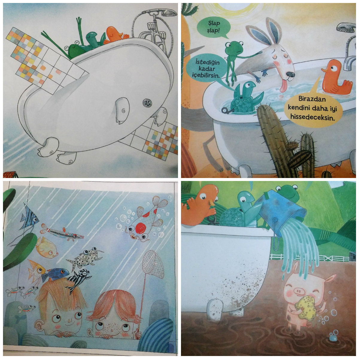 Mesafelere aldırmadan atlayıp küvetlerine, kimin nerede ihtiyacı varsa suya, onun yardımına koşuyorlar. Belki de uçuyorlar demeliyim, böylesi daha doğru. Neşeyle süzülüyorlar gökyüzünde. Derdi çeşit çeşit dostlarının teşekkürü de çeşit çeşit elbette. Birlikte eğlendikçe daha da mutlu oluyorlar. Ama her işin var bir çalışma saati, akşam olup ahali eve dönerken kahramanlar da biraz yorgun, bolca gururlu iniş yapıyorlar banyolarına. Ama, banyo saati gelen çocukları bekleyen bu sürpriz de ne?