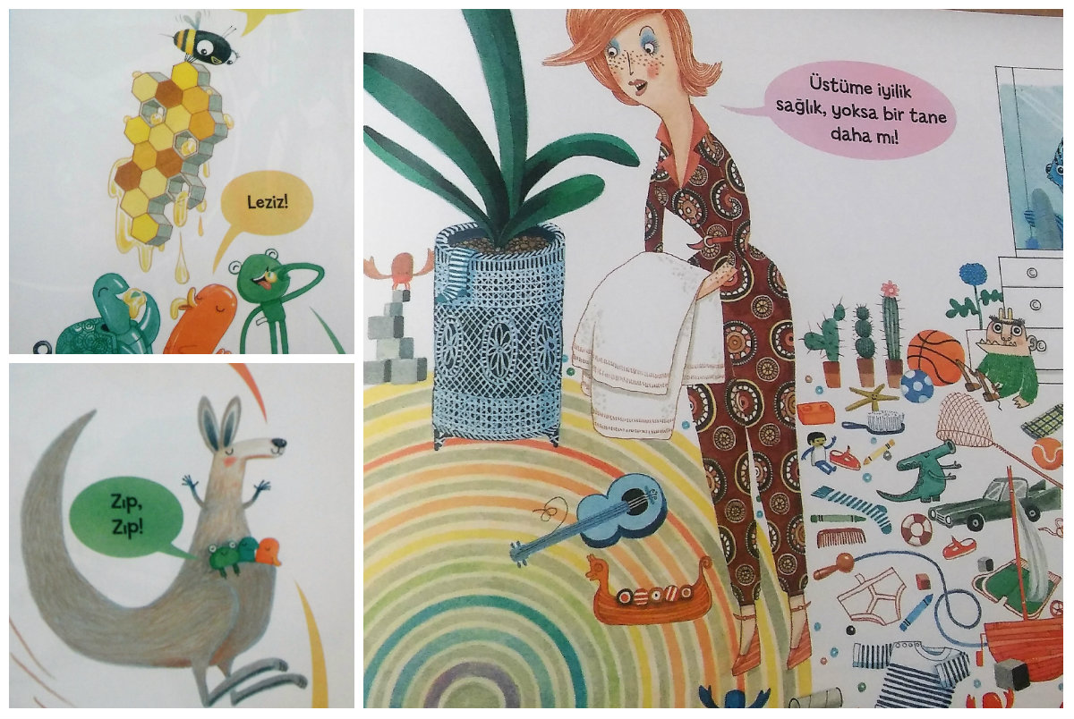 Uçan Küvet, hayal gücünün sınırsızlığına armağan kitaplardan. Evde yalnız kalan oyuncaklarının ne yaptığını kara kara düşünenler, onları bir de süper kahraman olarak düşleyip maceradan maceraya koşsunlar diye biçilmiş kaftan. Kim istemez oyuncaklarının peşi sıra bir babunla ağaca tırmanıp, bir kanguru ile zıp zıp zıplamayı? Kitabı okuduktan sonra en sevilen oyuncakların o gün neler yaptığı üzerine sohbetler etmek, onlar için yeni maceralar düşlemek, bu maceralara uygun giysiler, dekorlar oluşturmak kitapla ilgili keyifli etkinlik önerileri olabilir. Julia Donaldson’un Axel Scheffler ile birlikte çalıştığı kitapları çok sevdiğimi sıklıkla tekrarlıyorum fakat David Roberts’in resimlediği bu seri de o mükemmel uyumu yakalamış. Yine birlikte çalıştıkları ve Uçan Küvet’in bir sayfasından bize el sallayan Trol’den de yakın zamanda söz edeceğim.