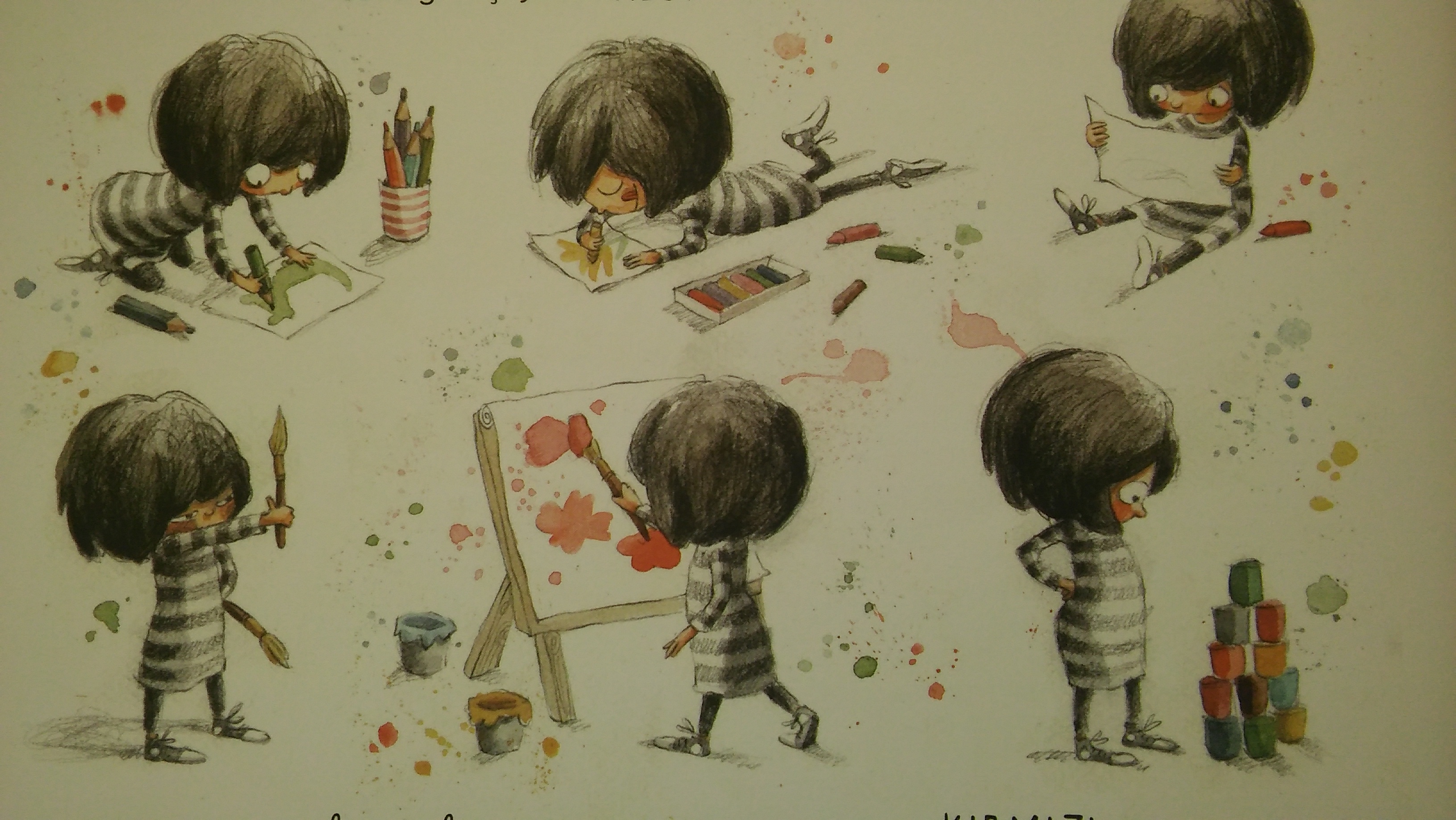 Hayvanlar, duygular, nesneler, yiyecekler ve elbette renklerle dolu Monika’nın yaşantısı. Keşfetme, kendi anlamlarını yaratma, bazen reddetme, yani bilme ile. Sorular soran bir minik o ve aslında ömrünün en büyük sorularından birinin cevabını aradığından habersiz. Yıllar geçtikçe, kokusunu, acısını, heyecanını, eksikliğini, varlığının huzurunu bulsa da; aramaya hep devam edecek katıksız sevginin anlamını. Öpücük Ne Renktir? çocuklara sebzelerin mükemmelliğini övmüyor, siyahı da sevebilmek için nedenler üretmiyor. Bir çocuğun dünyasından sesleniyor ve onun anlamlarına odaklanıyor. Renklerin ifade ettiği olumlu ve olumsuz anlamlar, çizimlerde öyle başarılı duygu geçişleriyle anlatılmış ki, bazen metin onun peşi sıra koşmuş; ancak bu koşu aralarındaki müthiş uyumu daha da heyecanlı kılmış bana kalırsa.