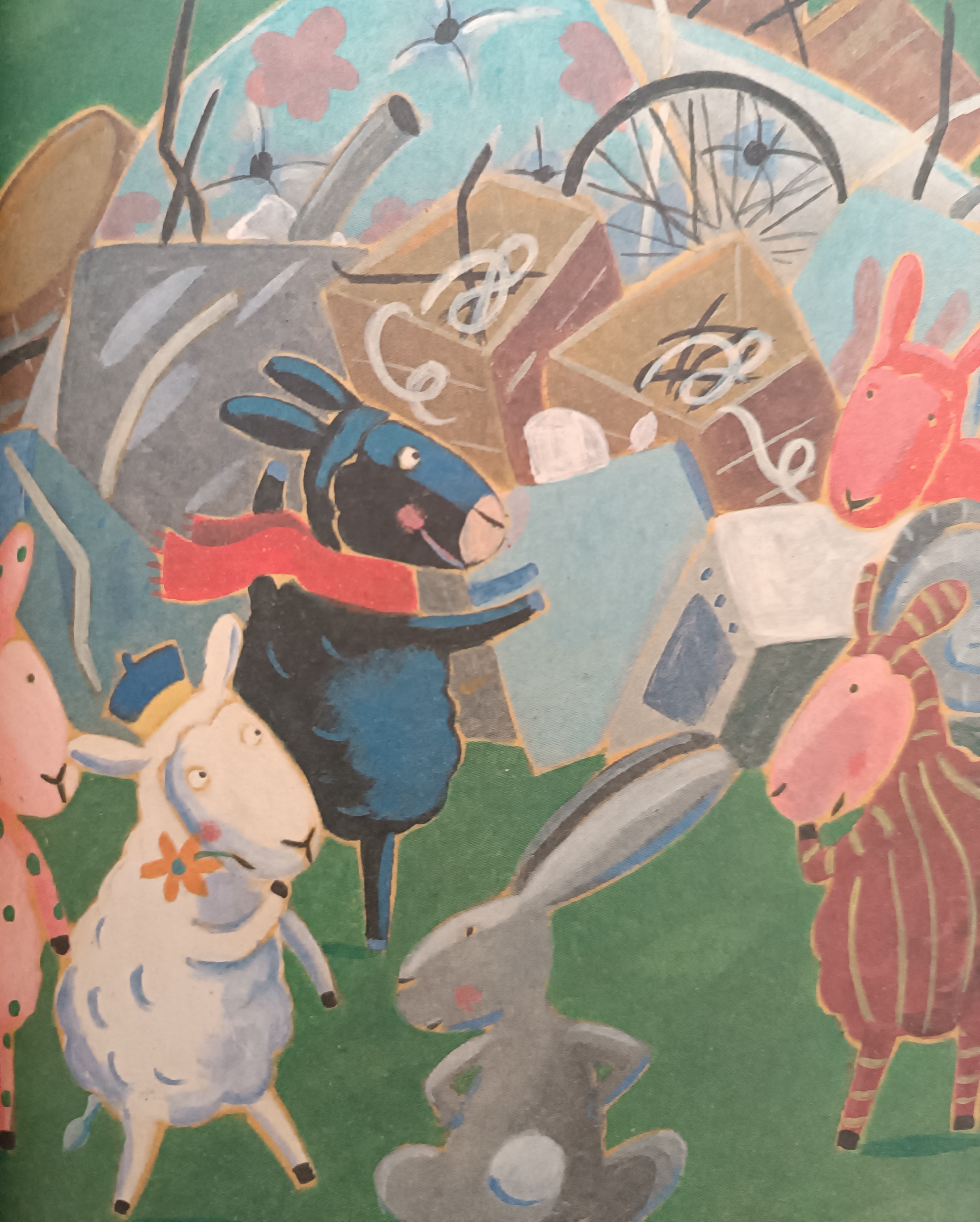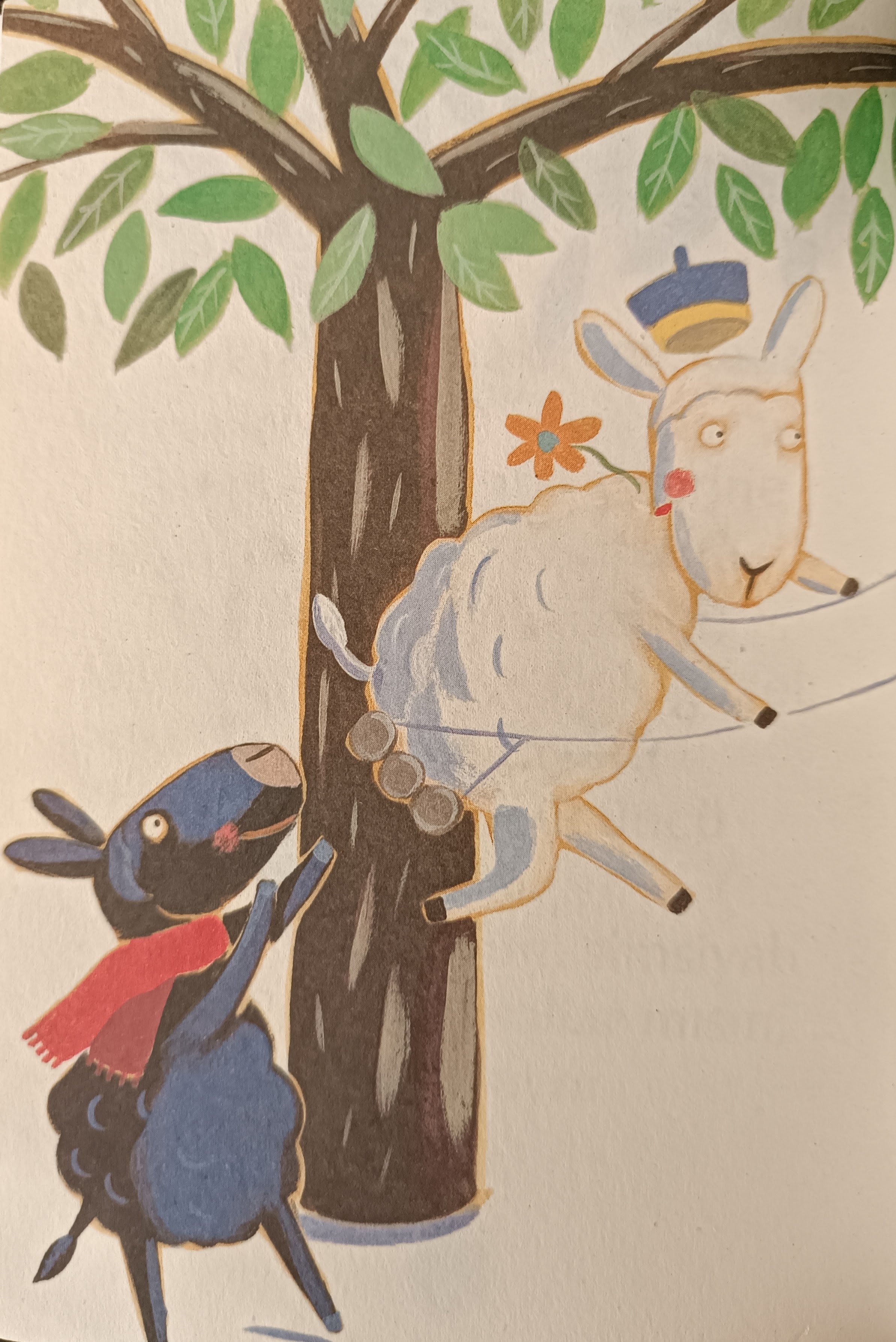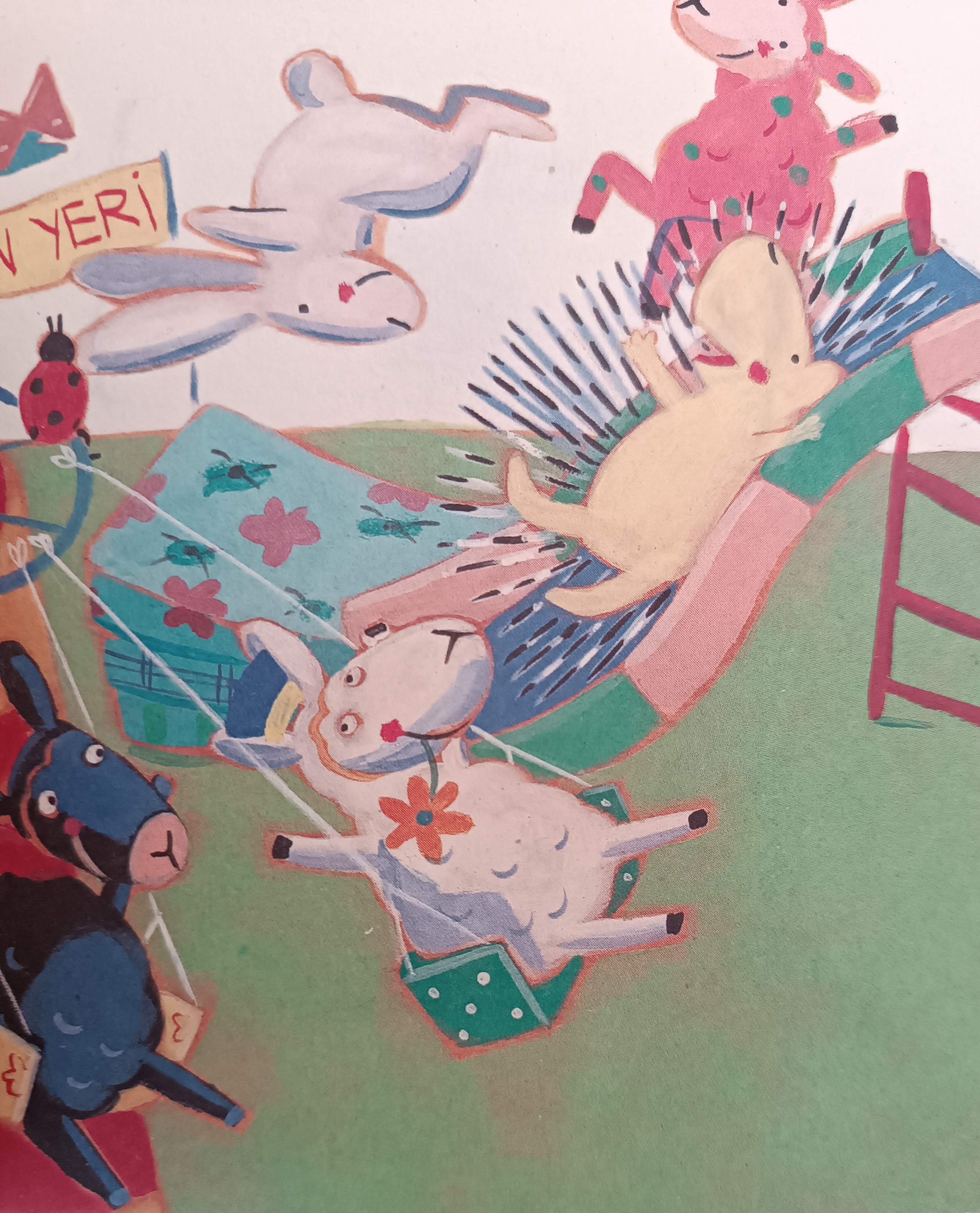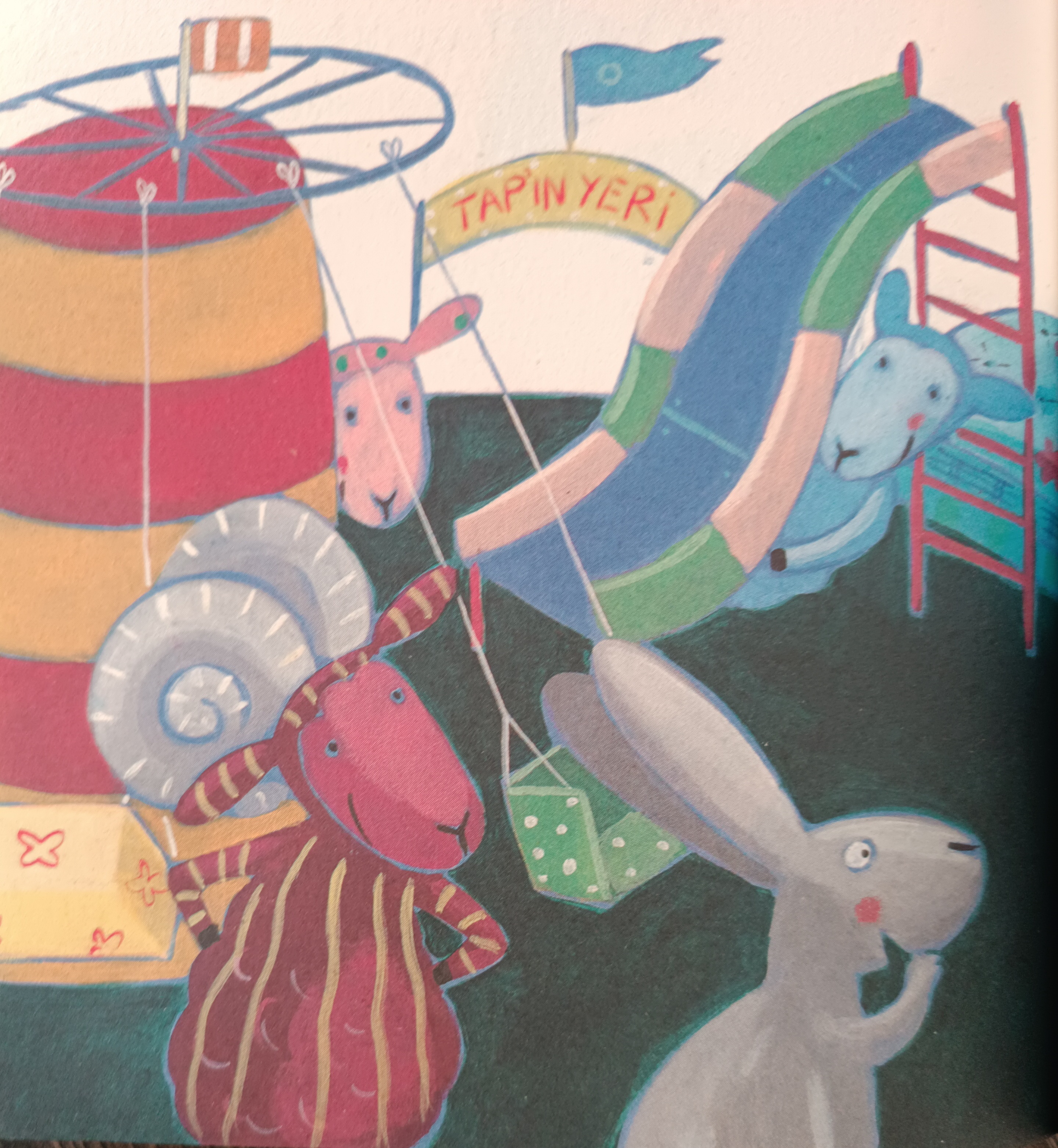 Kahramanların adları maceralarının şenliğine bir fikir veriyordur zaten. Olsun, birazcık da ben anlatmak isterim Akkuzu Karakuzu Lunaparkta’yı. Salıncakları var, ağaçları, yıldızları, bol bol neşeleri, “Me, me, meee! Ma, ma, maaa! Mi, mi, mii!” diye ilerleyen şahane şarkıları, bir de geceleri gökyüzüne bakarken sordukları büyük büyük soruları: Hareket eden yıldızlar mıdır, yoksa salıncaktakiler mi? Eğlene öğrene süren bir çayır tiyatrosu sanki bu kıvırcıklar her günü. Akkuzu çalıların arasında ağlayan Tavşan Tap’ın sesini duyana dek öyleydi demeli belki de. Tavşan Tap’ın hikâyesinde parlak gözlü devler, vantilatörler, kocaman kocaman aynalar, bayraklar; büyük bir gizem var. Mecburen gidilecek, yerinde öğrenilecek olan biten, düşecek yola kıvırcık kumpanyası. E peki, kirpi ve sincap nereden geldi olay mahalline? Siz şenlik bitti mi sandınız yoksa?